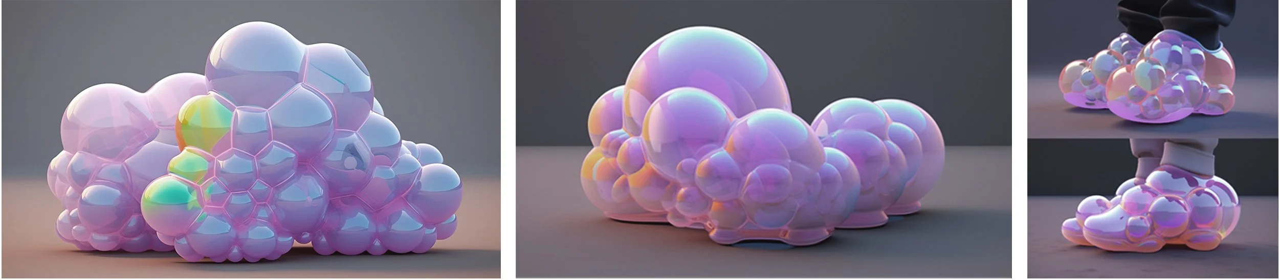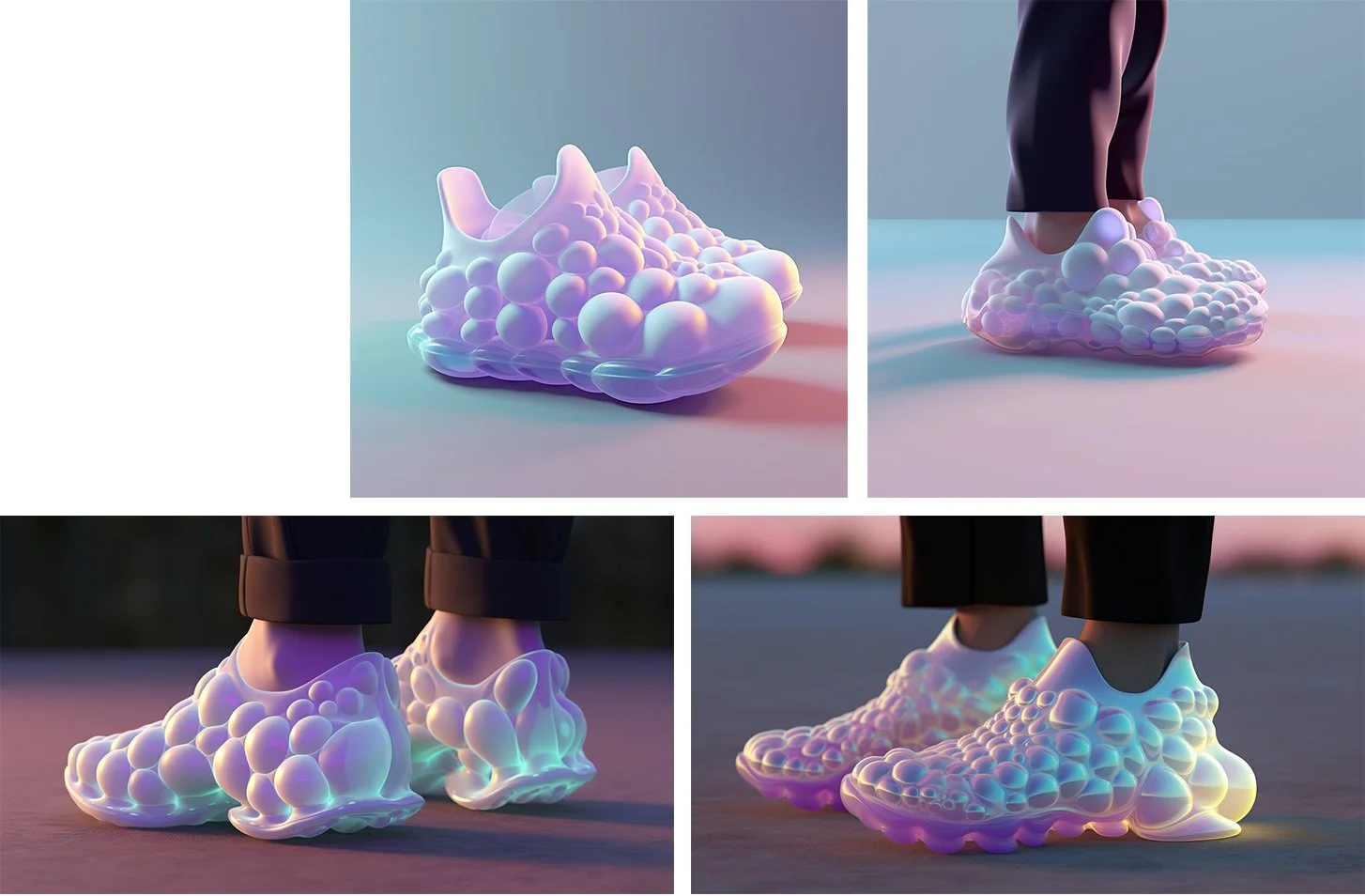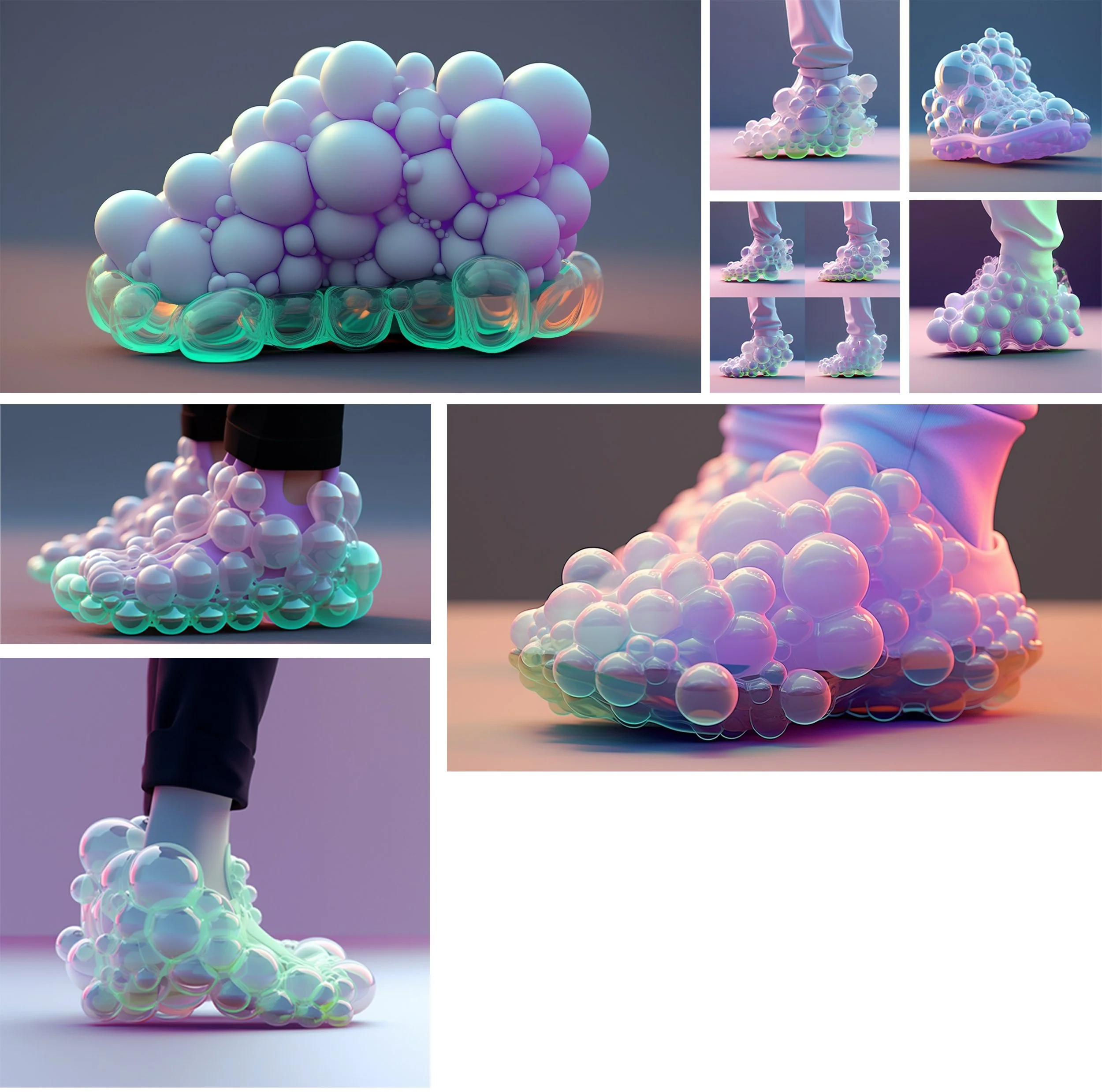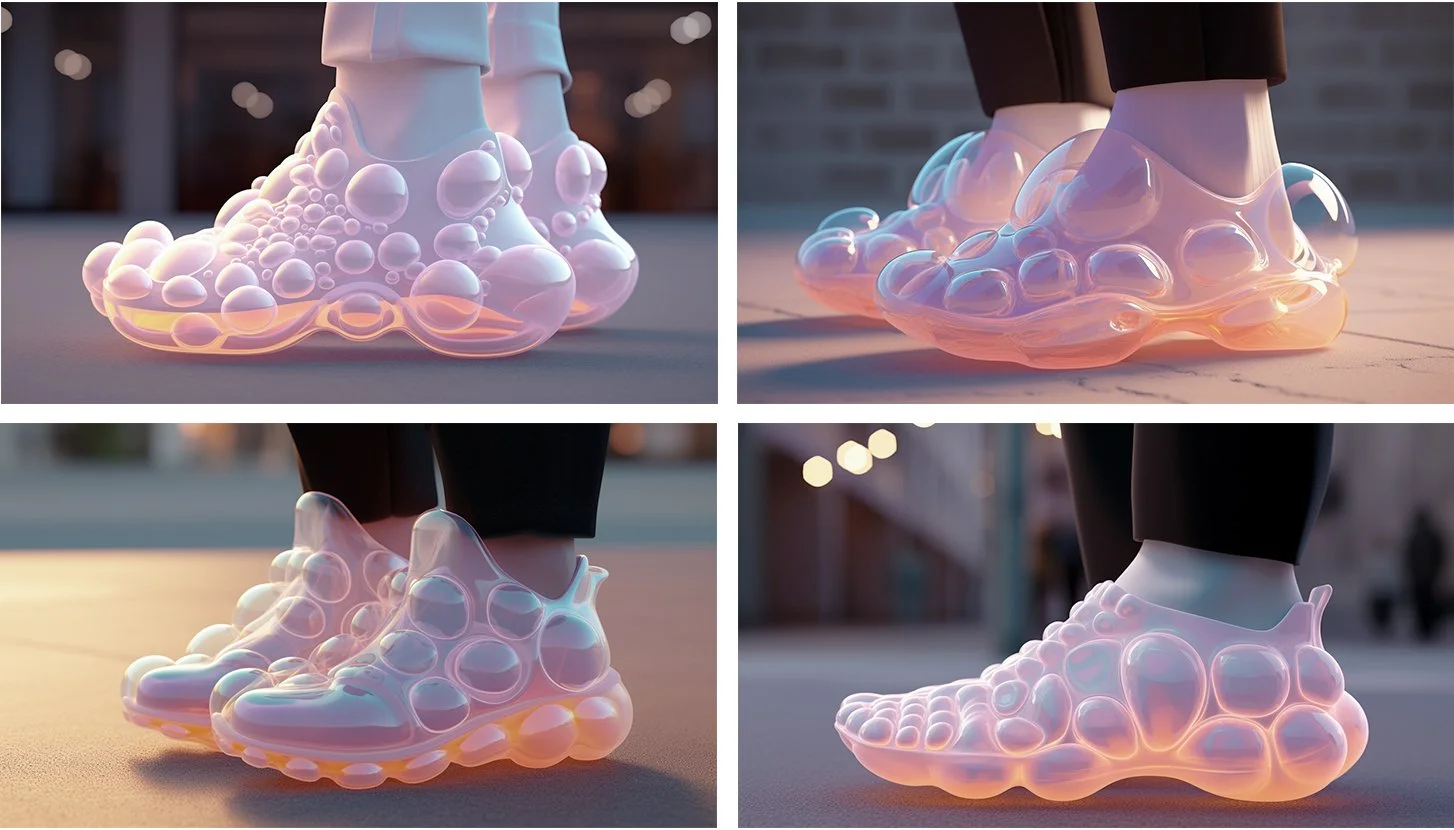 This project was produced using AI prompts. Starting with the concept of bubbles, the form language of the shoe was created